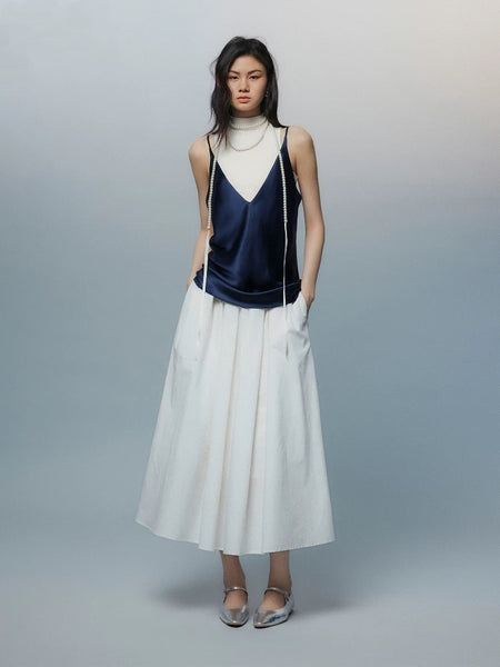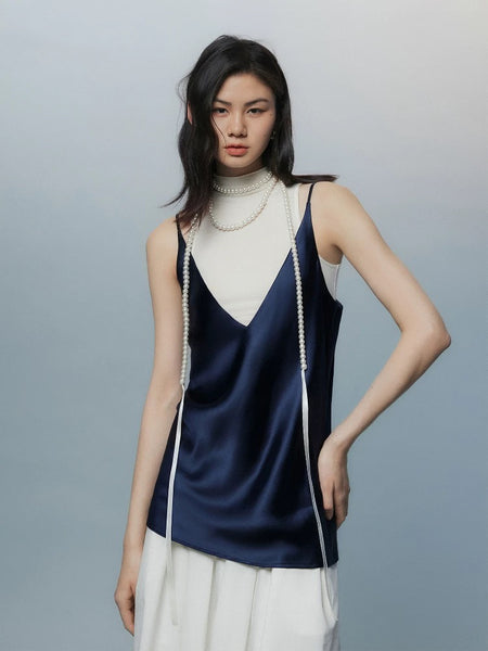 Tencel Blend High Neck Top // Satin Camisole Set in Navy/ White