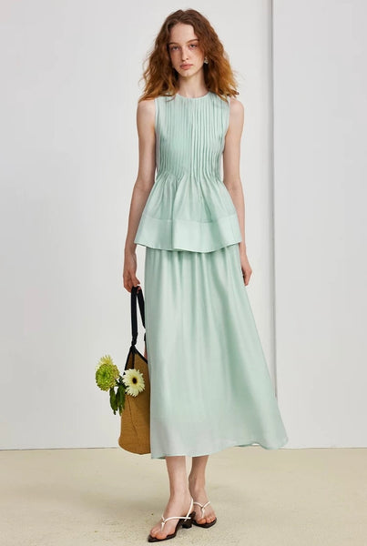 -Top: Round neckline, sleeveless, pleated detail, peplum cut