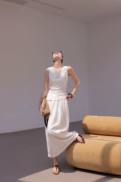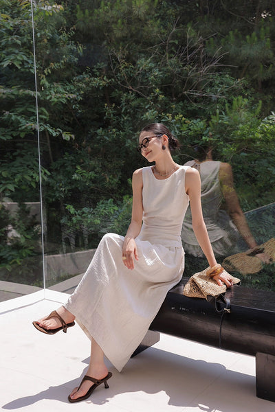 -Top: Round neckline, sleeveless, drape back with tie detail, side zip