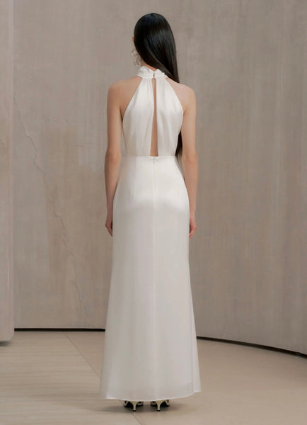 -High halter neckline, open back detail