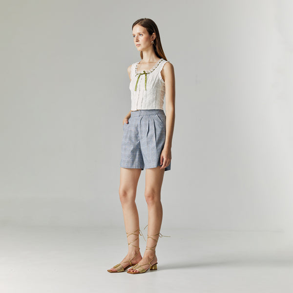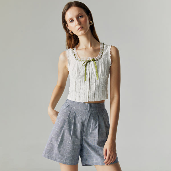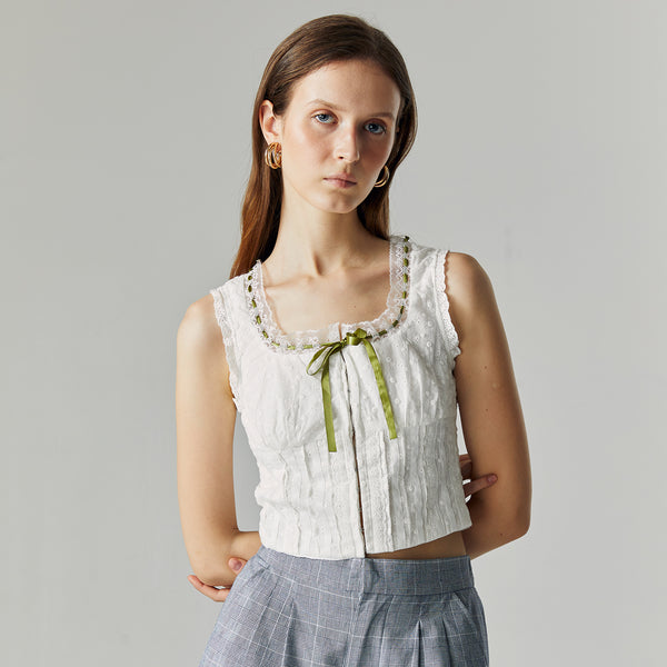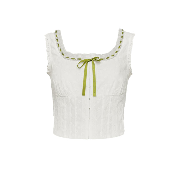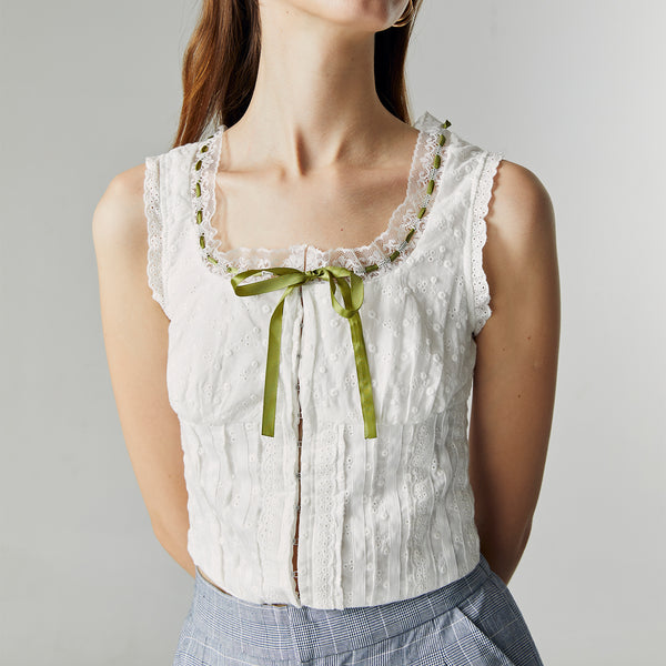 Romantic and vintage-inspired, this sleeveless top features delicate eyelet embroidery and lace trimming, finished with a soft ribbon accent at the neckline. The structured silhouette flatters the figure while maintaining a feminine, timeless charm.