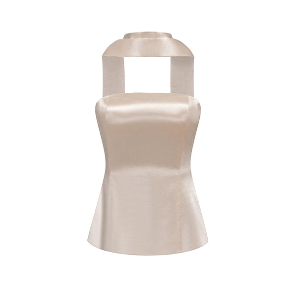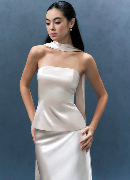 -Top: bustier neckline, adjustable neck drape, smocked back, peplum cut