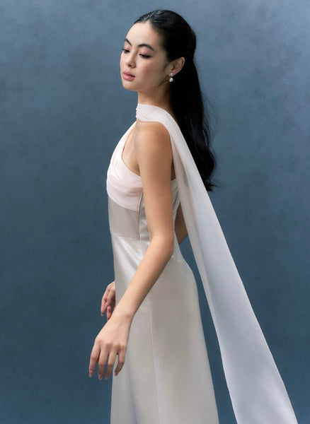 -Toga neckline, adjustable sheer drape