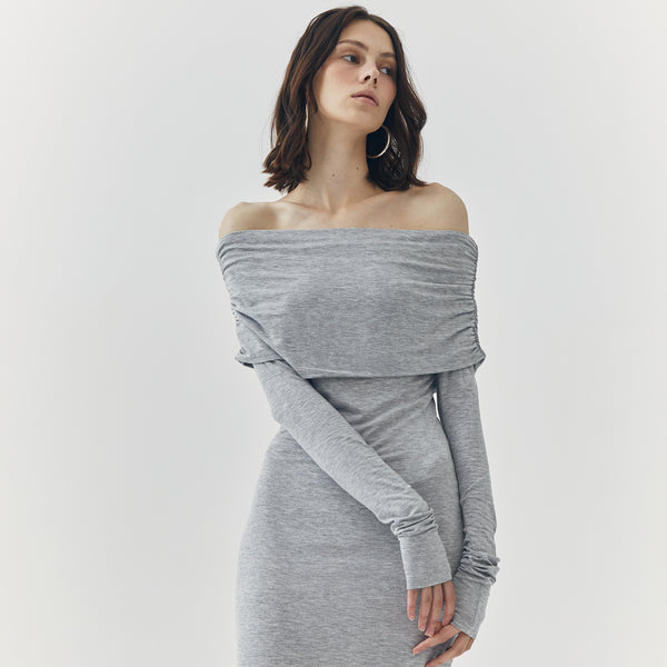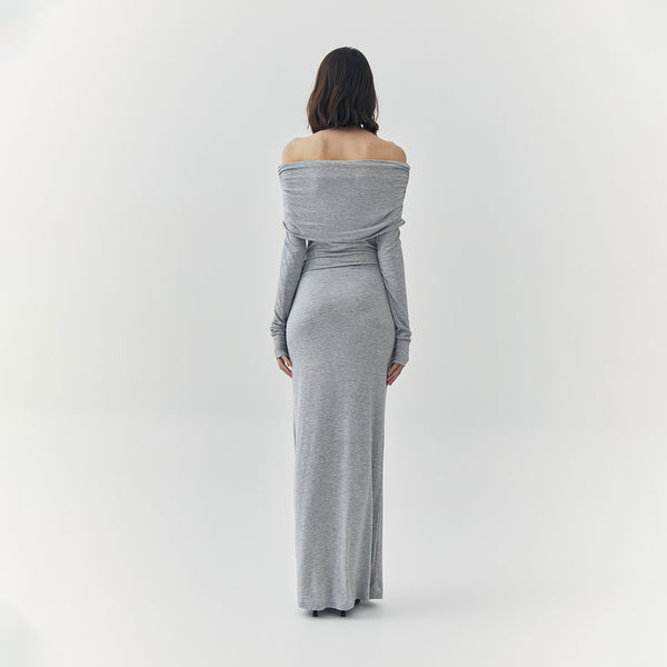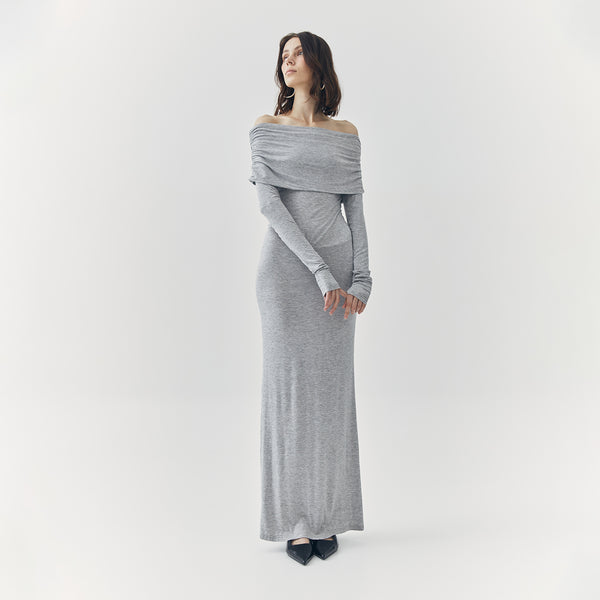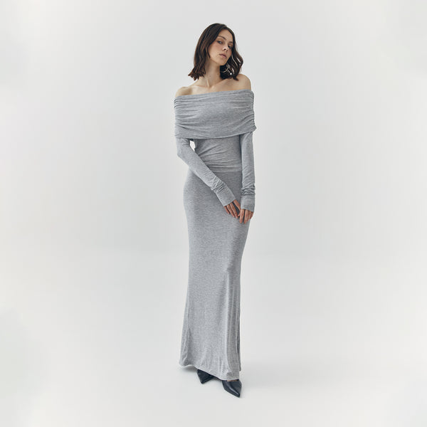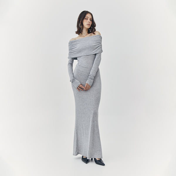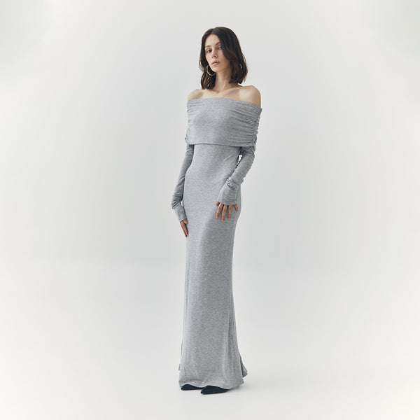 The Esme Off-Shoulder Long Dress exudes effortless elegance with its sleek silhouette and refined details. Crafted from a soft cotton-spandex blend, it offers a comfortable stretch while maintaining a flattering fit. The off-shoulder design and long sleeves create a timeless balance of sophistication and allure.