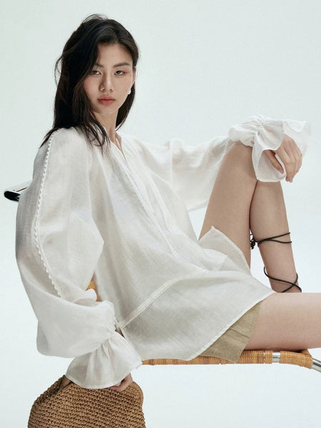 -V neckline with mandarin collar, blouson sleeves with flute cuff